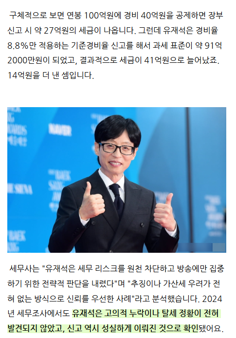 그리고 주변 연예인들의 선택을 보면 유재석의 경우 탈세 리스크를 최소화기 위해서 오히려 일반적으로 쓰는 장부 기장 신고 대신 기준경비율 신고를 통해 세금을 더 내기도 했는데요. 차은우 사태와 비교해보면 너무 비교가 됩니다.