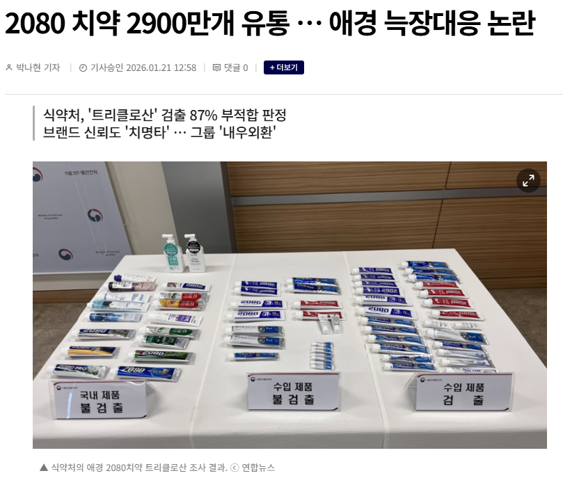 식품의약품안전처가 애경산업의 ‘2080’ 수입 치약 전 제조번호 제품을 전수조사한 결과, 수입 6개 품목에서 금지 성분인 트리클로산이 대규모로 검출된 것으로 확인됐다고 합니다. 식약처는 해외 제조소의 제조·세척 공정 관리 부실과 수입자의 회수 절차 미준수 정황을 함께 지적하며, 수입 치약 안전관리 체계를 전면 손질하겠다고 밝혔습니다.