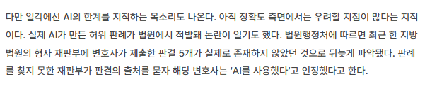 AI는 재미로는 사용할 수 있지만 환각 현상 때문에 세밀한 검증이 필요한데요. 실제로 AI가 만든 허위 판례가 법원에 적발된 사례도 있습니다.