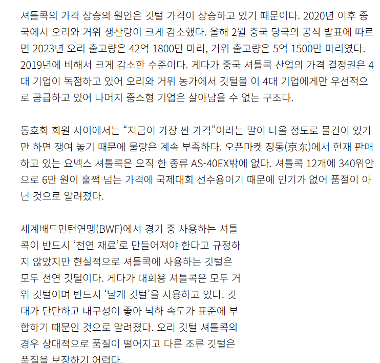 셔틀콕 가격 인상은 거위 오리 사육 농가가 줄었기 때문이라고 합니다.