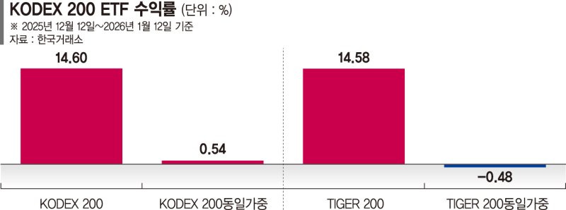 이는 모든 종목을 동일하게 구매하는 동일가중 ETF와 그냥 지수 상품을 비교해도 한눈에 알 수 있는데요. 한달간 TIGER 200의 경우 14.58% 오르는 동안 동일가중으로 구매했다면 오히려 이 불장에서도 손실이 나는 것을 알 수 있습니다.