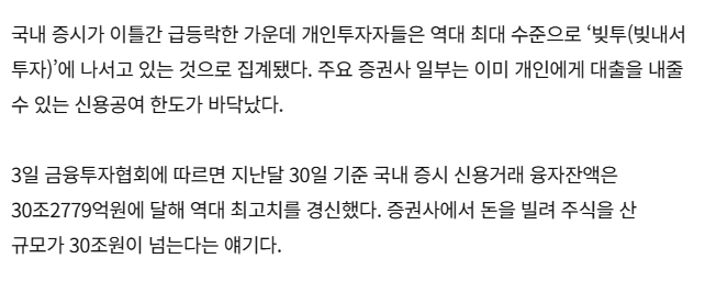 그 뿐만 아니라 빚투 역시 역대급이라고 하는데요. 신용거래 융자가 30조에 달한다고 합니다.