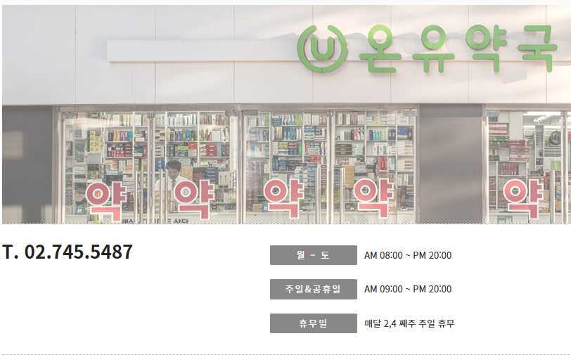 이 때 열려진 약국을 찾아보니 종로의 온유약국 토요일에도 8시까지 연다고 합니다. 이번처럼 2/4주차 일요일이 아니라면 일요일에도 연다고 하네요.