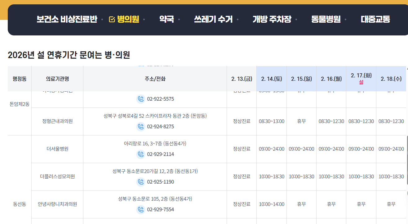 이처럼 각각 구청 홈페이지에서 설 연휴 비상 병의원을 손쉽게 확인할 수 있는데요.