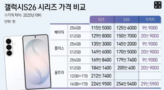 최근 반도체 메모리 가격인상에 따라 갤럭시 S25 대비해서 최소 9만 9천원에서 최대 29만 5900원까지 가격인상이 되었다는 점도 특징입니다. 그러다 보니 메모리 용량이 클수록 가격인상폭이 확실히 늘어났는데요.