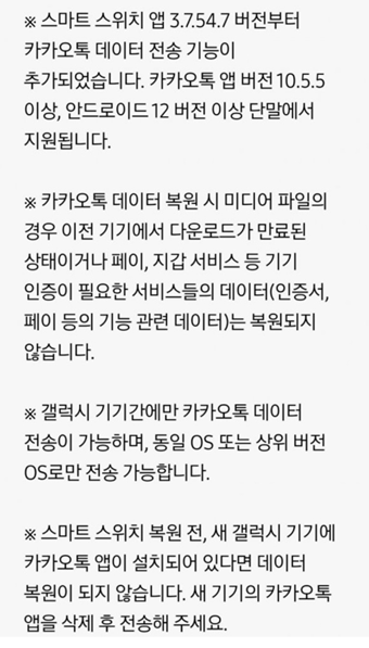 먼저 이번 갤럭시의 스마트 스위치가 업데이트 되면서 정식으로 카카오톡 데이터 전송기능이 추가되었습니다.