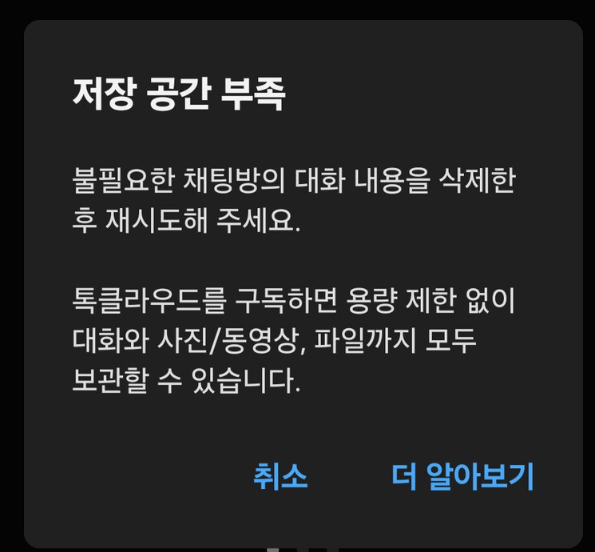 아래처럼 저장공간 부족이라는 메시지가 뜨면서 사람들이 수동으로 백업 용량을 찾아본 결과 약 50MB로 제한이 생기고 나서는 톡서랍을 구독하지 않으면 백업이 되지 않는데요.