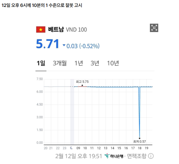 지난해 2월 12일 오후 6시 하나은행은 고시환율 입력 오류로 당시 베트남동 환율이 100동 기준 5.75원이던 게 0.57원으로 급락했습니다. 당시 하나은행 측은 “환율고시 key-in(명령 입력) 오류로 발생된 건”이라고 설명하면서 “전자금융거래법에 따라 충전 및 환전 거래를 취소하기로 했다”고 밝혔는데요.