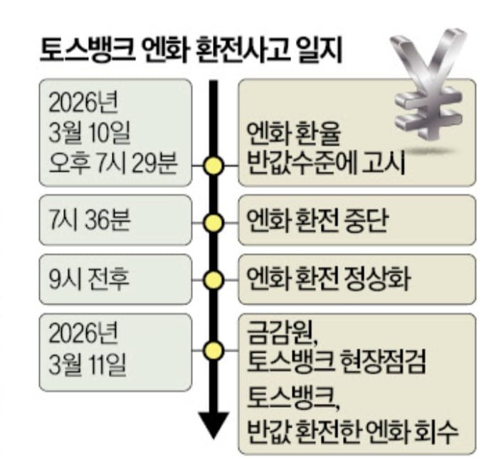 인터넷은행 토스뱅크가 엔화를 시세의 절반 수준에 판매하는 '반값엔화' 사고가 발생한 지 하루 만에 잘못 판매한 엔화를 회수하는 작업에 돌입하면서 많은 문제가 발생하고 있습니다.