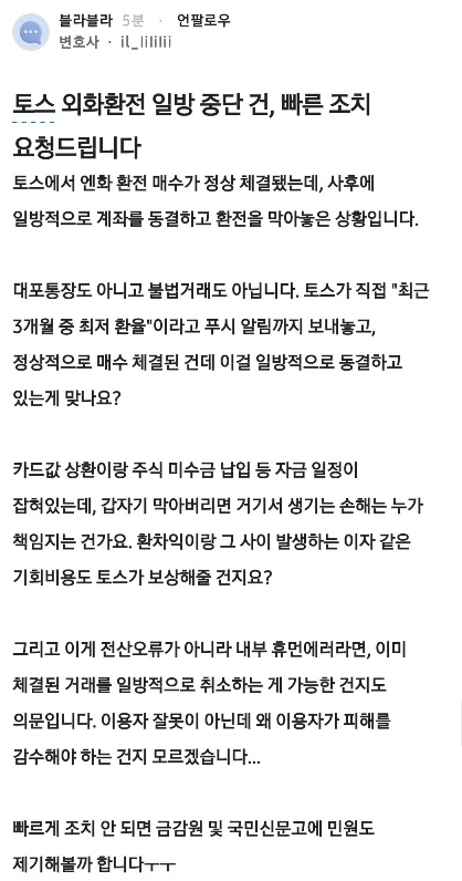 특히 사고 기간에 엔화를 이미 구매한 소비자가 이를 일본에서 카드결제 등으로 이미 사용한 경우, 소비자는 두 배의 비용을 들여 엔화를 구해 토스뱅크에 되갚아야 한다는 점도 문제입니다.
