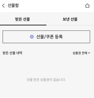 해당 메뉴에서 선물/쿠폰 등록을 눌러서 방금 카카오톡으로 온 핀번호를 입력해주시면 됩니다.