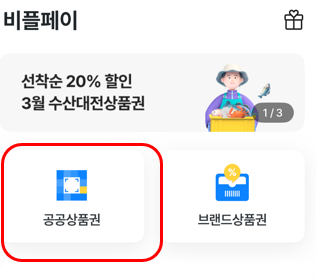 비플페이 - 공공상품권 메뉴로 이동한 다음 메뉴 하단에 위치한 선물함에 선물/쿠폰 등록 메뉴에서 상품권을 등록 가능합니다.