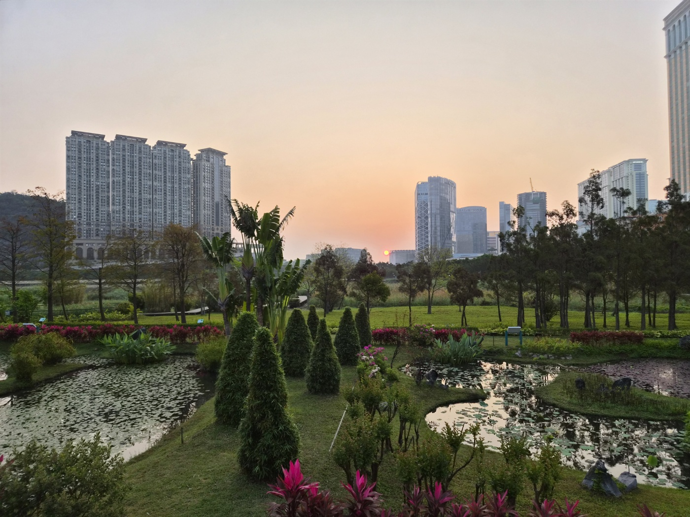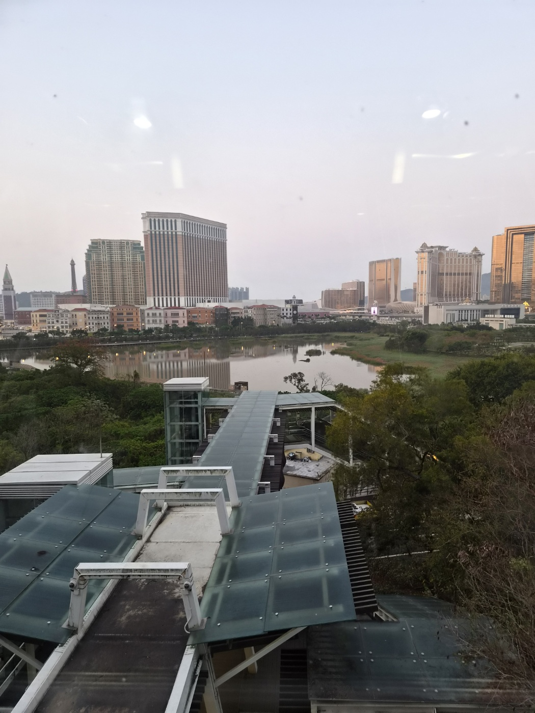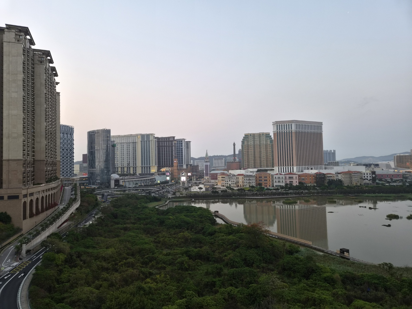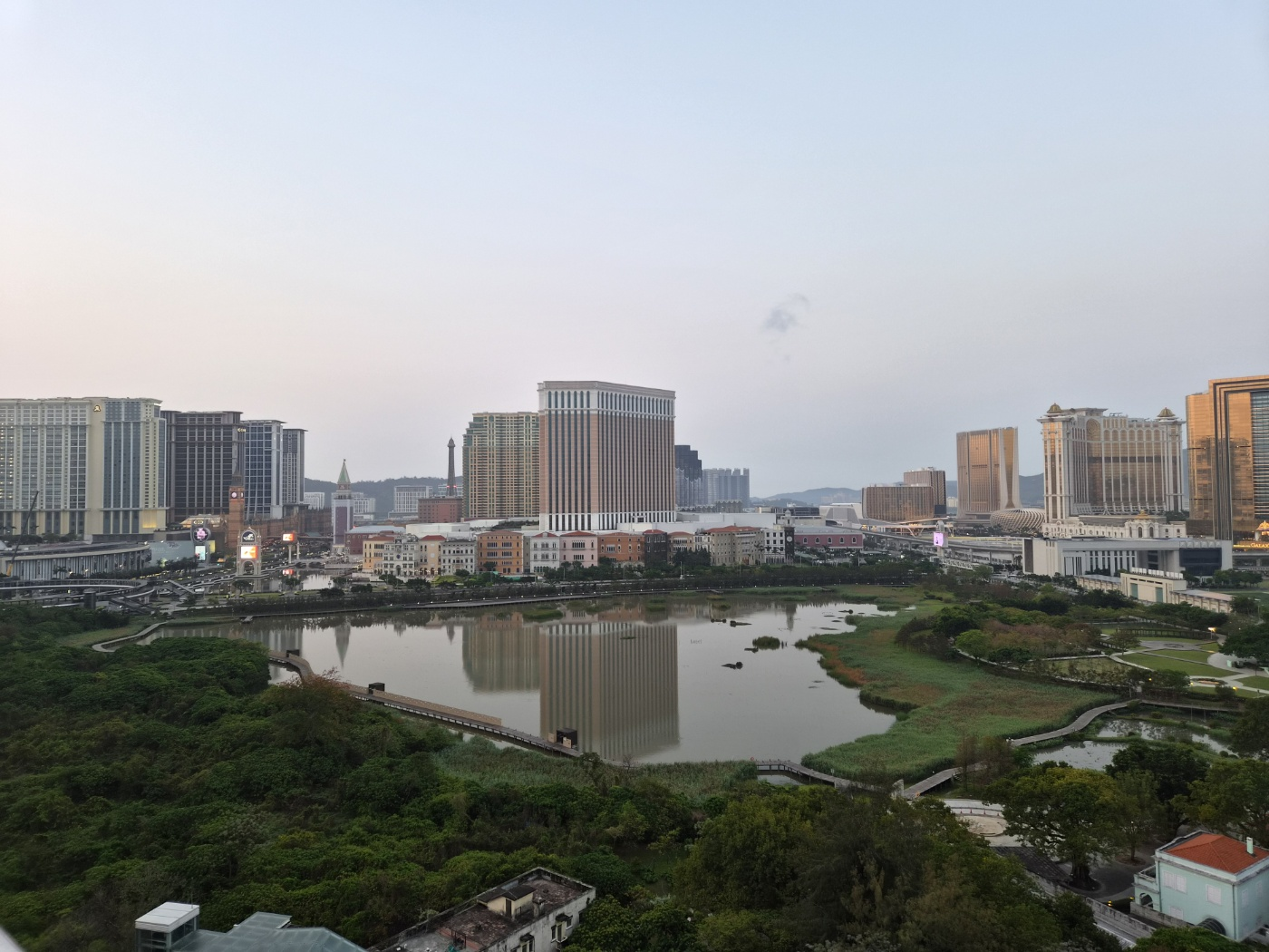 타이파 빌리지의 붉은 지붕들과 코타이 스트립의 거대한 호텔군(갤럭시 마카오, 베네시안 등)을 한 화면에 담을 수 있습니다.