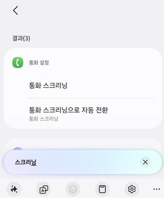 갤럭시 S26의 갤럭시 One UI 8.5 업데이트할 경우 아래처럼 설정에서 통화 스크리닝을 검색하면 사용할 수 있습니다.
