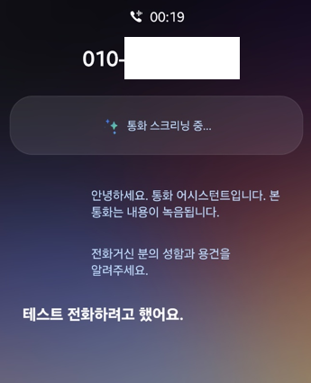 갤럭시 스마트폰에서 통화 스크리닝 기능을 활성화하면, 전화하면 바로 아래처럼 통화 스크리닝 모드가 활성화되고, AI음성으로 전화거신분의 성함과 용건을 알려달라고 메시지가 나옵니다.
